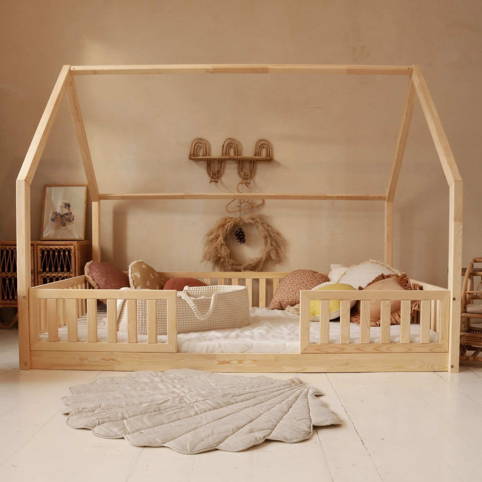 Lit cabane bois naturel Lolita en 140x200cm avec 2 barrières de sécurité